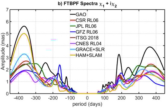 Fourier Transform Band Pass Filter (FTBPF) amplitude spectra of the GAO, GSMAM, GRACE + SLR, and HAM + SLAM computed in a broadband with (a) a 60–3000 day cut-off and (b) 60–450 day cut-off. The parameter λ describing the filter bandwidth when computing the FFBPF spectra was equal to 0.018. The minus time period on the plot indicates retrograde terms while plus time period indicates prograde terms.
