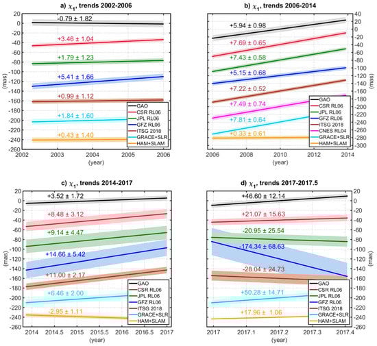 Trends in χ1 component of GAO, GSMAM, GRACE + SLR, and HAM + SLAM together with their errors for four time periods: (a) 2002–2006, (b) 2006–2014, (c) 2014–2017, (d) 2017–2017.5. The values are given in mas/year. The shades show the errors of trends determined. Note that CNES RL04 data covered only the period 2006–2014 in full and was not included in (a), (c) and (d).