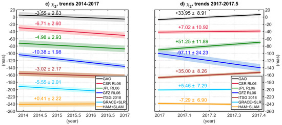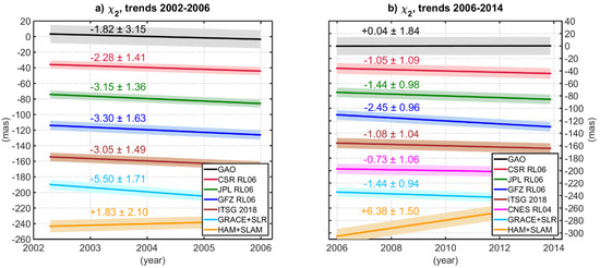 In terms of χ1, apart from 2002–2006 period, GAO is characterized by positive trend (Figure 4). As it was expected, for the period of the highest GRACE accuracy, the GSMAM trends in χ1 are very compatible with each other and with GAO trend (Figure 1b). For this period, the maximum difference between GAO trend and GSMAM trend reaches 1.75 mas/year (for CSR RL06), while the minimum difference is equal to 0.79 mas/year (for GFZ RL06). For each considered time interval, GSMAM overestimates χ1 GAO trend while HAM + SLAM underestimates it. For χ2, the GAO trend signs are less steady (Figure 5). As it can be seen from Figure 5, χ2 GSMAM trends are the most consistent with GAO trends and with each other for the initial period of the GRACE mission (2002–2006). For this time interval, the maximum difference between GAO trend and GSMAM trend reaches 1.48 mas/year (for GFZ RL06), while the minimum difference is equal to 0.46 mas/year (for CSR RL06). Notably, in the period of the lowest GRACE observations errors (2006–2014, see Figure 1c,d) GSMAM trend signs in χ2 are inconsistent with GAO trend sign (Figure 5b). We can generally conclude that the trend of HAM + SLAM series processed by GFZ is rather incompatible with trend of GAO for both χ1 and χ2. Note that trends for the period 2017 until 2017.5 are reported for completeness, but not discussed due to the limited data coverage in that period.