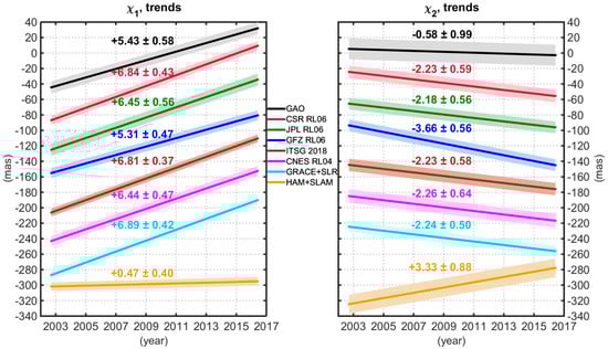 Trends in χ1 and χ2 components of GAO, GSMAM, GRACE + SLR, and HAM + SLAM together with their errors. The shades show the errors of trends determined. The values are given in mas/year.