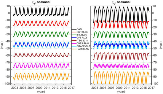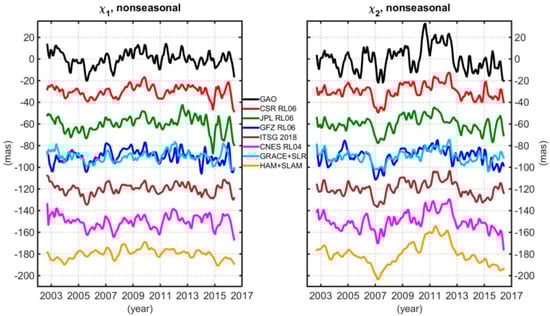 We now focus on several analyses of GAO, GSMAM, GRACE + SLR and HAM + SLAM conducted for the same period, namely between September 2002 and June 2016. The most common methods to compare PM excitation series from different data sources involve either comparing full time series [12,14,30,37,60,61,62] or decomposing them into seasonal and non-seasonal oscillations [8,15,17,18,45]. We now decompose all series into linear trends, and seasonal and non-seasonal changes. To calculate linear trends and seasonal oscillations, we use a least-squares method to fit a seasonal model to the series. The model comprises the first-degree polynomial and the sum of sinusoids with the periods of 365.25, 182.625, and 121.75 days [8]. In order to analyze seasonal variations, we remove the trends. Non-seasonal changes are obtained after removing trends and annual, semi-annual, and ter-annual signals.