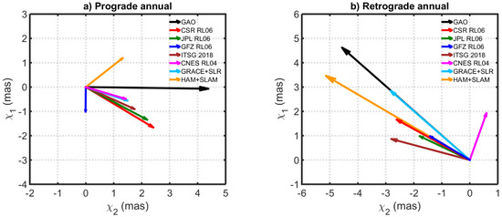 Phasor diagrams of prograde and retrograde annual variation in χ1 + iχ2 for GAO, GSMAM, GRACE + SLR, and HAM + SLAM. Phase φ of the oscillation is defined by the annual term as sin(2π(t − t0) + φ), where t0 is the reference epoch (1 January 2004).