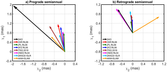 Phasor diagrams of prograde and retrograde semi-annual variation in χ1 + iχ2 for GAO, GSMAM, GRACE + SLR, and HAM + SLAM. Phase φ of the oscillation is defined by the semi-annual term as sin(4π(t − t0) + φ), where t0 is the reference epoch (1 January 2004).