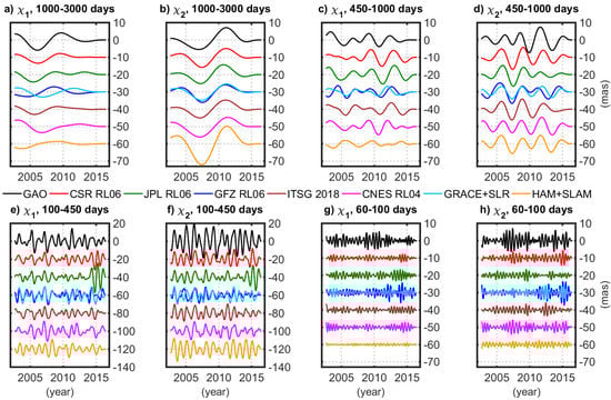 Changes with the periods of 1000–4000 (a,b), 450–1000 (c,d), 100–450 (e,f), and 60–100 (g,h) days in χ1 and χ2 components of GAO, GSMAM, GRACE + SLR, and HAM + SLAM.
