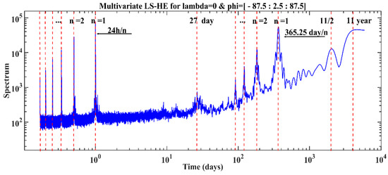 Figure 3 illustrates the resulted spectrum for 71 TEC time series located at and , i.e., at a specific longitude and different latitudes. It shows that there are regular signals, in agreement with the findings of Amiri-Simkooei and Asgari [16]. Common-mode regular signals can be detected using the multivariate analysis. The spectrum shows a periodic pattern with periods of 24/n hour, n = 1,2,…,6. Therefore, the spectral peaks are at the harmonics of 1–6 cycles per day. Higher harmonics could likely be seen if the sampling rate was higher than 2 hours. A periodic pattern with periods of 365.25/n days, n = 1,2,…,4, is the most obvious annual signal and its higher harmonics. In addition, there are three signals with periods of 27 days, 11 years, and 5.5 years, which are in conjunction with the solar cycle periods. As can be seen in Figure 3, the detected signals (peaks) are more elongated/flattened at lower frequencies (e.g., 5.5 year or 11 year periods), which is due to the leakage effect in the spectral analysis [33]. Longer time series are required to see the detected signals sharper.