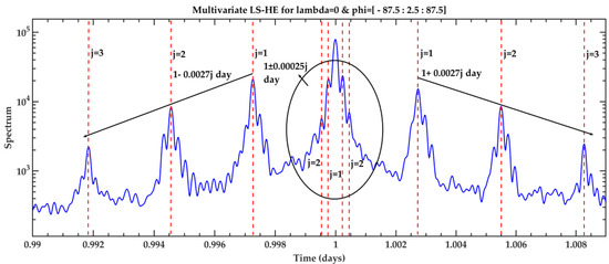 The regular signals with the periods mentioned above are not the only signals in the TEC time-series. A zoom-in on the diurnal signal in Figure 3 shows signals close to that diurnal signal (Figure 5). There are a series of peaks, with the periods close to the diurnal signal having the periods of days (). Each pair of plus and minus signals corresponds to the diurnal signal modulated with the annual signal. The same situation holds also true for harmonics higher than the diurnal signal, i.e., semi-, tri-, and quad-diurnal signals. These are consistent with the findings of Amiri-Simkooei and Asgari [15]. Furthermore, closer to the diurnal signal, we also found other signals with periods of days (), which are modulated into the diurnal signal (Figure 5, vertical dashed lines within the ellipse). The diurnal signal is modulated with 11 year signals of the solar cycle. The same situation holds also true for the higher harmonics of the diurnal signal.