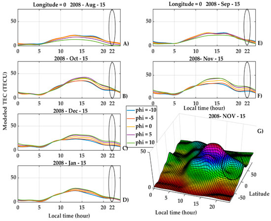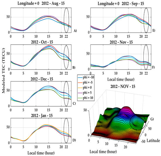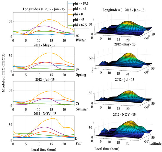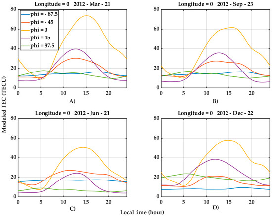 Figure 6 shows the vertically modeled TEC values at the latitude and longitude of 0° in 2012. The vertical TEC values close to the equinoxes (80th and 264th days of a year, equivalent to 21 March and 23 September, respectively) are larger than those for the solstices (172nd and 355th days of the year, equivalent to 21 June and 22 December), in agreement with the previous work. Figure 7 shows the vertical TEC values at the equinoxes and solstices in local times, at different latitudes, and when . We observe that this anomaly occurs at lower and mid-latitudes during the daytime. Also, the VTEC value of the March equinox is larger than that of the September equinox. Similar results were reported by Millward et al. [27], using the coupled thermosphere ionosphere plasmasphere (CTIP) model; by Balan et al. [28], using the middle and upper atmosphere (MU) radar observations; and by Meza et al. [20], using PCA and WT for VTEC. In addition, we also observed that the March equinox has a similar pattern to the September equinox at different latitudes. This is not the case, however, for the June solstice when compared to the December solstice. An interchange between the southern and northern hemispheres at different latitudes can be observed (Figure 7C,D).