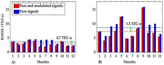 Root mean squared error (RMSE) values for total electron content (TEC) prediction in (A) low (2008) and (B) high (2013) solar activities at the latitude and longitude of 0°. The red color is related to the model with both pure and modulated signals, and the blue color is related to the model only with pure signals. The dashed line shows the yearly RMSE.