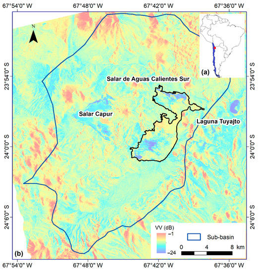Study area: (a) Location within Chile, (b) Sentinel 1B image, VV polarization in decibels (dB), ascending pass, acquired on 3 April 2018, indicating the location and contour of the salar in yellow. The sub-basin has an area of 671,576 km2. From: http://www.geoportal.cl. (Coordinate system: GCS_WGS_1984).