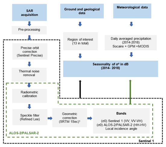 As seen in Figure 2 the methodological flowchart included the collection and analysis of meteorological information, download and pre-processing of the Sentinel 1 and ALOS-2/PALSAR-2 images, analysis of the geology and selection of regions of interest. The overall process is detailed below.