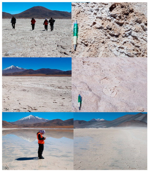 Field observations, morphological analysis, and geological data over the Salar de Aguas Calientes Sur were conducted on 3 April 2018. Salt crust and brine samples were collected jointly with Centro de Información de Recursos Naturales and Servicio Nacional de Geología y Minería [4] for geochemistry characterization. The geochemistry of water and salt crusts was not extensively measured but is generally known from other contemporary measurements [20]. Morphological and mineralogical features were extensive over the surface of the salar. Field observations showed highly heterogeneous pan crust environments that could be grouped into three different crust types (Figure 3 and Figure 4).
