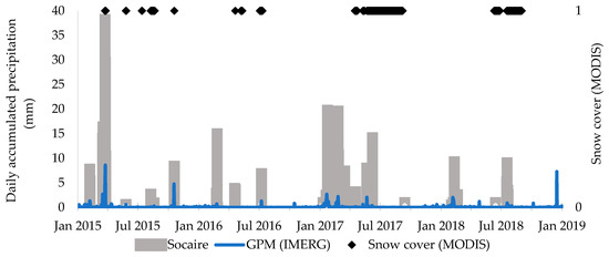 Meteorological data of the station Socaire, GPM (IMERG) and snow cover between January 2015 and December 2018, where 0 is no cover, and 1 indicates snow cover.