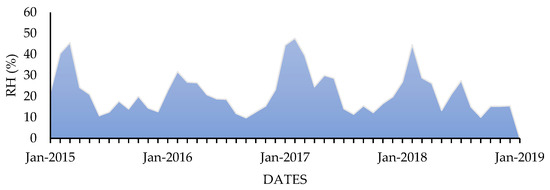 Temperature data indicated average values of 12 °C for the winter months and 23 °C for summer, with the highest temperatures recorded during January. Figure 6 shows relative humidity (RH) through the study period. As for the relative humidity (RH), the Socaire station registered high values (38%) during the Altiplanic winter months (December to March), and an average 21% in southern winter (June to September). The wettest year was 2017 (25% average) coincident with the La Niña event and the driest 2016 (19% average). Finally, the wind does not have a specific temporal pattern.