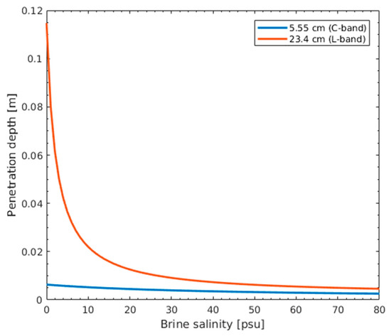 C- and L-band penetration depth δp through a saturated saline soil of varying brine salinity. The dielectric constant is computed by means of a simple dielectric mixing model.