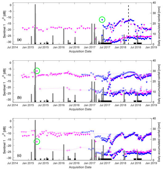 Sentinel 1 temporal backscattering observed over the salt pan. Sentinel 1A (magenta) and Sentinel 1B (blue) in ascending (full markers) and descending (empty markers) orbits. VV polarization is indicated as triangles, and VH are circles. The vertical black dashed line indicated a field visit on 3 April 2018 (see Figure 4). (a) Soft pan crust (site S1), the local incidence angle is between 35.2°–35.4° (ascending only), (b) Hard-pan crust 2 (S6), the local incidence angle is between 39.9°–40.1° (ascending), and 31.1°–31.3° (descending), (c) Hard-pan crust 1 (S10), local incidence angle is between 39.2°–39.3° (ascending), and 32.2°–32.3° (descending). Sentinel 1A VH polarization is available from February 2017. The green circles indicate episodic events: on 26 May 2017 for site S1 and on 13 April 2015 for sites S6 and S10. Daily accumulate rainfalls recorded at Socaire are in grey bars, and snowfall cover also shown as black crosses.