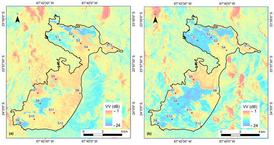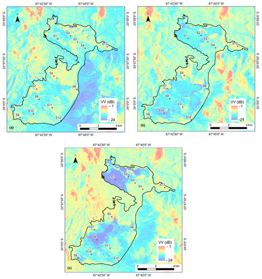 Similar results were found at the Chott el Djerid Tunisia [6,7,8] in different climatic and geographic conditions, located near sea level (15 m.a.s.l) with precipitations events mainly in winter, dry and warm summer, and mean annual rainfall between 75–100 mm (almost the half of the amount for Salar de Aguas Calientes, Chile) without snowfalls. The authors show a relation in C-band monitoring changes over evaporitic surfaces and present that backscattering power increases where VV-polarized σ0 markedly raised during the evaporation phase in summer, being stable while humidity lacks, and either decreases rapidly due to precipitations in winter. In Figure 9 and Figure 10, VV-polarized σ0 maps showed the vast superficial extensions over the salt flat affected either by flooding or snowfall events. In the case of flooding events, the areas are coincidental with previous studies for Salar de Aguas Calientes [2,4].
