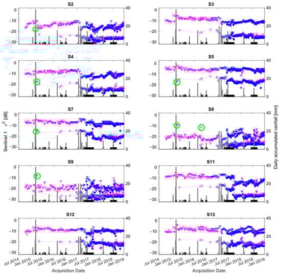 Sentinel 1 temporal backscattering observed over the salt pan for the remaining sites considered in this study. Sentinel 1A (magenta) and Sentinel 1B (blue) in ascending (full markers) and descending (empty markers) orbits. VV polarization is indicated as triangles, and VH are circles. The green circles indicate episodic events: on 13 April 2015, for sites S4, S5, S7, S8, S9, and 20 April 2016, for site S8. Daily accumulate rainfalls recorded at Socaire are in grey bars, and snowfall cover also shown as black crosses.