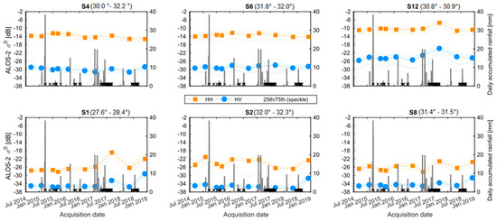 ALOS-2/PALSAR-2 temporal backscattering observed over the salt pan. Sites corresponded to Hard crust 2 (upper panel) and Soft crust (bottom panel). Ascending orbit. The local incidence angles are indicated in degrees. Daily accumulate rainfalls recorded at Socaire are in grey bars, and snowfall cover also shown as black crosses.