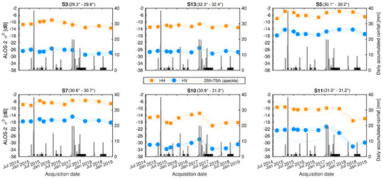The longer penetration depth at L-band in comparison to that of C-band allowed interpreting ALOS-2/PALSAR-2 σ0 in terms of subsurface scattering rather than surface scattering. For ALOS-2/PALSAR-2, variations in both HH- and HV-polarized backscattered power from 2014 to 2018 are shown in Figure 12 for type 2 Hard and Soft crusts, and Figure 13 for type 1 Hard crust. Images were acquired on ascending passes only with local incidence angles ranging from 30° to 35°. In what follows, seasonal, annual, and episodic temporalities were analyzed together.