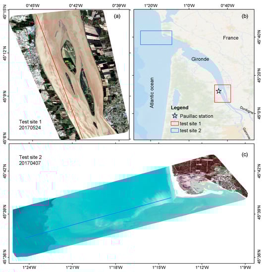The study area is the GE (Figure 1) situated in the south-west of France. It is a typical test site for the remote sensing of turbid waters, where SPM concentrations vary from ~1 to ~1000 g·m−3 within surface waters. Suspended sediments are the dominant factor affecting the water signal, with concentrations fluctuating mainly depending on the discharges of the Dordogne and Garonne Rivers and on tidal currents [20]. We selected two subsets from the estuary (Figure 1b). The first one (test site 1) (Figure 1a) is the central part of the estuary where the maximum turbidity zone (MTZ) is usually located. The Pauillac autonomous turbidity station is operated in this area. The other subset (test site 2) (Figure 1c) is located in the moderately turbid mouth area where the river plume extends during high river discharge conditions.