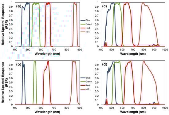 Relative Spectral Responses of OLI (a), MODIS (same for Terra and Aqua) (b), Pleiades-1A (c) and Pléiades-1B (d) at Blue, Green, Red and NIR wavebands.
