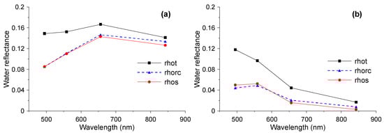 Examples of Pléiades-derived reflectance signal at the top of atmosphere (rhot), Rayleigh corrected reflectance (rhorc) and surface reflectance (rhos) after ACOLITE-DSF processing for (a) test site 1 on 24 May 2017, and (b) test site 2 on 7 April 2017.