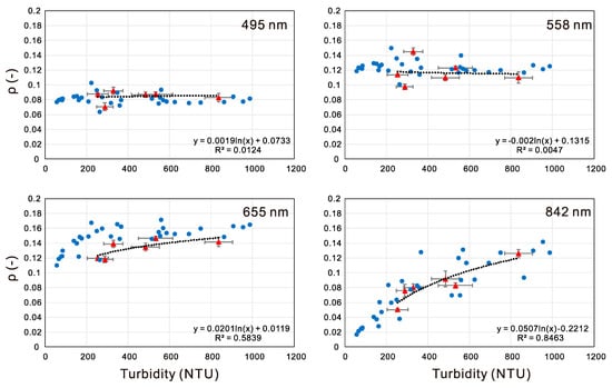 The relationships between the Pléiades-derived water reflectance, respectively at 495, 558, 655 and 842 nm, and synchronous in situ turbidity values measured at the Pauillac autonomous station were compared to the relationships previously established based on in situ data (SeaSWIR dataset) for test site 1. The relationships retrieved from Pléiades data were comparable to those obtained from the field dataset (Figure 5). The in situ (blue points) and satellite (red points) water reflectance values vs. turbidity values overlap at 495 and 558 nm bands. The Pléiades-derived water reflectance signal at these two wavelengths tends to saturate in the highly turbid waters of the GE [44]. The ρ495 signal is apparently not sensitive to turbidity variations, and the same was observed at 558 nm. The saturation reflectance can be determined by a Nechad-type function [44,45], and was found to be 0.087 at 495 nm and 0.116 at 558 nm. The saturation effect had similar values of 0.081 and 0.123 in the in situ data. At higher turbidities of around 500 NTU, the Pléiades-derived water reflectance in the red band also saturates (0.160), again close to the in situ observation (about 0.164). The Pléiades-derived water reflectance at 865 nm shows a logarithmic increase with increasing turbidity without saturation, also as previously observed based on in situ measurements.