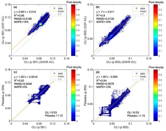 Comparisons between SWIR and DSF derived water reflectance values for OLI (ρ561) (a) and OLI (ρ655) (b). Comparisons between OLI (ρ561) and Pléiades (ρ558) (c), OLI (ρ655) and Pléiades (ρ655) (d) reflectance values over test site 2 on 7 April 2017.