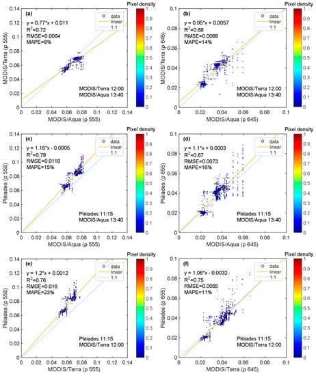 Comparisons between MODIS/Terra (ρ555) and MODIS/Aqua (ρ555) (a), MODIS/Terra (ρ645) and MODIS/Aqua (ρ645) (b), MODIS/Aqua (ρ555) and Pléiades (ρ558) (c), MODIS/Aqua (ρ645) and Pléiades (ρ655) (d), MODIS/Terra (ρ555) and Pléiades (ρ558) (e), and MODIS/Terra (ρ645) and Pléiades (ρ655) (f) water reflectance values (test site 2) on 7 April 2017.