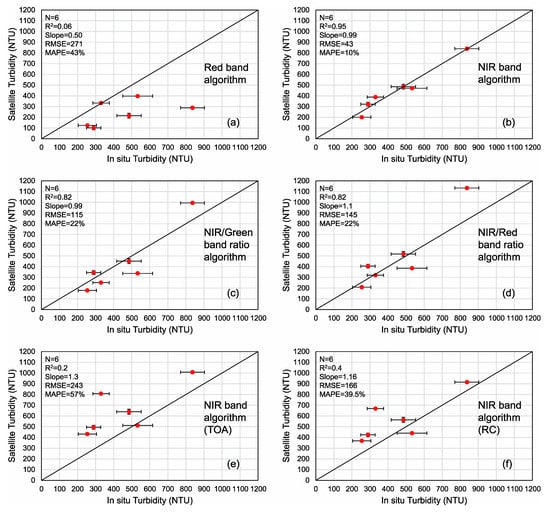 Very good agreement between satellite and in situ turbidity was found for the range of 200–840 NTU (Figure 8b): RMSE of 43 NTU and MAPE of 10%. The linear regression slope is 0.99 and R2 is 0.95. These results show a large improvement over using top-of-atmosphere (MAPE 57%) (Figure 8e) or Rayleigh-corrected (MAPE 40%) (Figure 8f) reflectances, indicating the need for a full atmospheric correction even for extremely turbid waters.