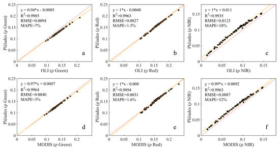 Relationships between water reflectance in the green, red and NIR spectral bands of Pléiades-1B and L8-OLI sensors (a–c), Pléiades-1B and MODIS-A (d–f). The red dashed lines are 1:1 lines and the oranges lines are the best Ordinary Least Squares linear fits.