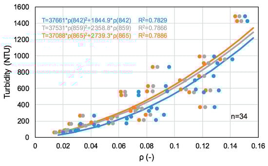 Turbidity (NTU) = 37661 × ρ8422 + 1845 × ρ842 (R2 = 0.78)