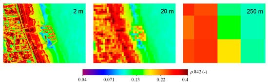 Spatial variability was also examined using resampled Pléiades imagery by comparing the original 2 m data to simulated 20 and 250 m data. The effects of spatial resolution on the correspondence with in situ measurements at the Pauillac station on 24 May 2017 show differences of 0.31% for the 2 m, 8.27% for the 20 m and 26% for the 250 m resampled Pléiades imagery. The coarser resolution shows a worst correspondence with the in situ measurements due to the increase of turbidity to the shallow shores of the estuary, and mixed pixel effects that include land and platform reflectances (Figure 11).