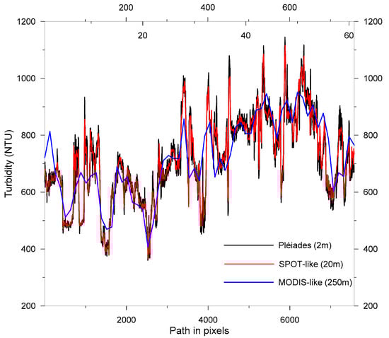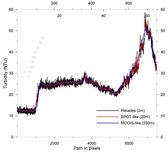 Comparisons between turbidity in Nephelometric Turbidity Unit (NTU) retrieved from Pléiades data at different spatial resolutions along a transect, from west to east in test site 2 (blue line on Figure 1c) on 7 April 2017.