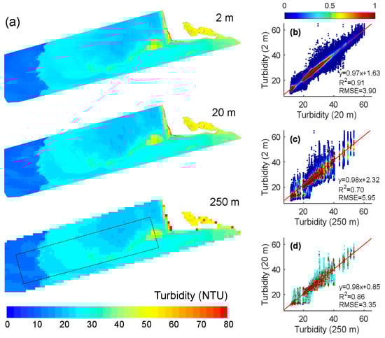 Comparison between Pléiades turbidity in Nephelometric Turbidity Unit (NTU) (24 May 2017) resampled to different spatial resolutions: (a) maps at 2, 20 and 250 m, and scatter plots comparing (b) 2 and 20 m, (c) 2 m and 250 m, (d) 20 m and 250 m turbidity values. The black square shows the area of interest considered in the scatter plots and the color bar denotes pixel density.