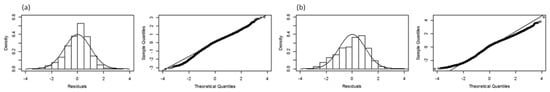 Residual distributions and quantile–quantile plots for diagnostic analysis of the final generalized additive models (GAM) with prediction variables (presented in Table 1) based on fishery and remote sensing data aggregated into (a) monthly 5° × 5° and (b) weekly 1° × 1° grids.