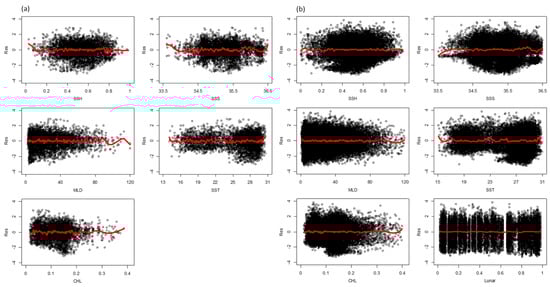 Scatterplots of residuals for environmental factors in the final GAM with variables listed in Table 1 based on fishery and remote sensing data aggregated into (a) monthly 5° × 5° and (b) weekly 1° × 1° grids. The red solid lines in each panel represent the pattern of residuals fitted using a spline function for each environmental variable.