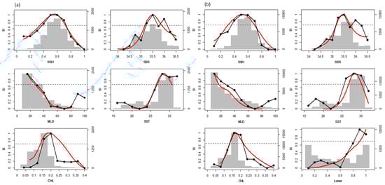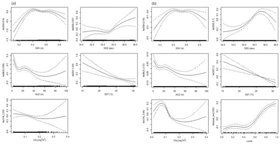 Despite the lunar effect, which was only incorporated into the fine-resolution model, the results indicated that scale had negligible effects when modeling the habitat ranges of widely distributed species such as swordfish (see Figure 3 and Figure 4 for comparison). This is consistent with conclusions drawn by Bigelow et al. [5]; SST at different spatio-temporal scales was noted to have similar effects on the catch rates of swordfish in waters near the Hawaiian Islands. However, as demonstrated in the fine-resolution GAM analysis in this study, CHL exhibited a clearer pattern at levels < 0.2 mg/m3, which serves as an important indicator for detecting the transition zone in the Pacific Ocean [25,26]. This result could be related to local variations in CHL due to upwelling and the local topography [27].
