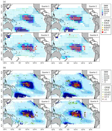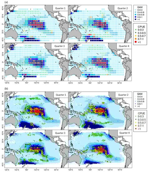 Distributions of observed nominal catch rates of swordfish for 2009–2015 overlapping on the maps of predicted relative densities using the final GAM with variables listed in Table 1 based on fishery and satellite-based remotely sensed environmental data aggregated into (a) monthly 5° × 5° and (b) weekly 1° × 1° grids.