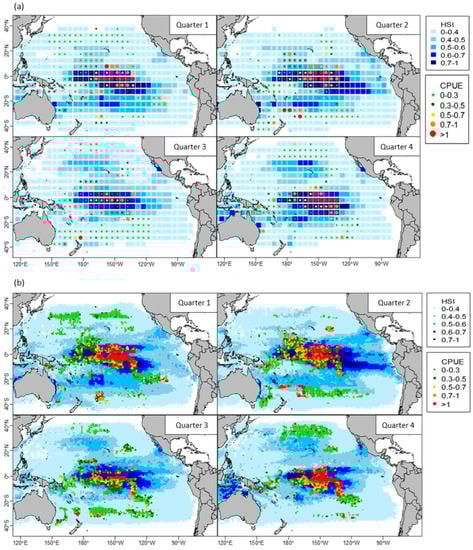 The distributions of nominal and predicted catch rates of swordfish using GAMs showed similar spatial patterns for all seasons, regardless of the resolution used (Figure 5). Similar patterns were found with habitat SI models used to predict the spatial distribution of swordfish (Figure 6). Both nominal and predicted catch rates were high between latitudes 15°N and 15°S (the equatorial area). However, the two modeling approaches slightly differed in their spatial predictions for waters near New Zealand and the central East Pacific Ocean, particularly for the first half of the year (Figure 5 and Figure 6).
