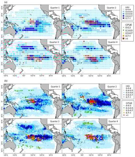 Similar to Figure 7, but HSI models were used for prediction. (a) monthly 5° × 5° grids; (b) weekly 1° × 1° grids.