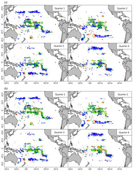 Distributions indicating differences by level between the nominal observations and predicted values using (a) the final GAM with variables listed in Table 1 and (b) HSI models with variables listed in Table 2 based on fishery and remote sensing data aggregated at the weekly 1° × 1° resolution. Small differences are marked as blue and green points, and large differences are marked as yellow, orange and red points.