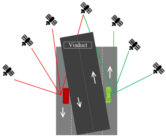 However, few researchers have investigated the performance of RTK AR by fusing sensor data from connected vehicles [34]. GNSS RTK is the most cost-effective way for a high-precision position if the observation condition is good. For connected vehicles, even if one vehicle’s GNSS signal is partially blocked and fails in AR, GNSS observation from multiple vehicles can be complementary. Fusing these GNSS observations can greatly improve the geometry of the GNSS observation equation, improve the fixed rate of ambiguity, and improve the positioning accuracy of all the connected vehicles. For example, in Figure 1 the red and green vehicles are moving below a viaduct and the red one can only receive satellite signals coming from the left half of the sky and the green one receives signals coming from the right half of the sky, so that the two vehicles share complementary GNSS observation.
