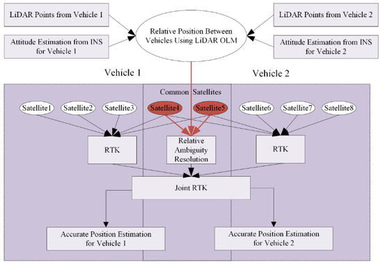 Our cooperative GNSS-RTK ambiguity resolution model for two connected vehicles is relatively simple, and a more complete model will be investigated in the future to address the multi-vehicle networking environment. Relative positions will be calculated by our INS aiding LiDAR OLM method for multiple vehicles in the network, which will increase computation costs. Our relative ambiguity resolution method with relative position constraint and joint RTK method are easy to be expanded to a multivehicle networking environment, but the number of parameters will increase along with the number of vehicles. Therefore, if there are large quantities of vehicles in the network, solving Equation (23) and Equation (28) will become difficult. In the future, we will also focus on this issue.