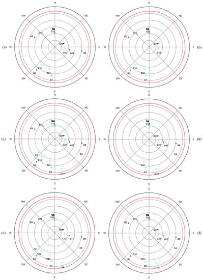 Sky plots of available satellites from multi-GNSS system above the vehicles’ horizon at the first epoch for (a) vehicle 1 in the open area, (b) vehicle 1 below the viaduct, (c) vehicle 2 in the open area, (d) vehicle 2 below the viaduct, (e) vehicle 1 and vehicle 2 (the connected vehicles) in the open area, and (f) vehicle 1 and vehicle 2 (the connected vehicles) below the viaduct. The multi-GNSS system is used including GPS (in blue) and the BeiDou Navigation Satellite System (BDS) (in cyan). The serial numbers of GPS satellites start with letter “G” and those of BDS start with letter “C”.