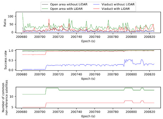 Regarding relative ambiguity resolution in the above subsection C, we compare the results of using relative position constraint from LiDAR scan-to-map matching (denoted as “with LiDAR” in Figure 8) and not using this constraint (denoted as “without LiDAR” in Figure 8). Figure 8 shows the ratio and success rate of the fixed relative ambiguities and the number of common nonreference satellites for vehicle 1 and vehicle 2 in four cases: the operation is in the open area without LiDAR, below the viaduct without LiDAR, in the open area with LiDAR, and below the viaduct with LiDAR. From Figure 8 we can see that in the open area the vehicles share more common satellites so that the success rate values for the two cases in open area cases (represented by the black line and green line in Figure 8) are high and close to 1. But the ratio values for the case in the open area without LiDAR constraint are much smaller than the ratio values for the case with LiDAR constraint, which means that the LiDAR constraint can help fix the ambiguities and makes AR more reliable, and that even in the open area with sufficient available satellites this constraint is able to largely increase the ratio values. This is reasonable, because if the relative position constraint is not considered, vehicles’ predicted positions are calculated by GNSS pseudorange measurements which include large errors so that the float solutions of relative ambiguities may not be reliable and the ratio values are small.