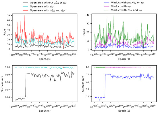 Time series of ratio values, success rate and the number of common reference satellites between the two vehicles for four cases.