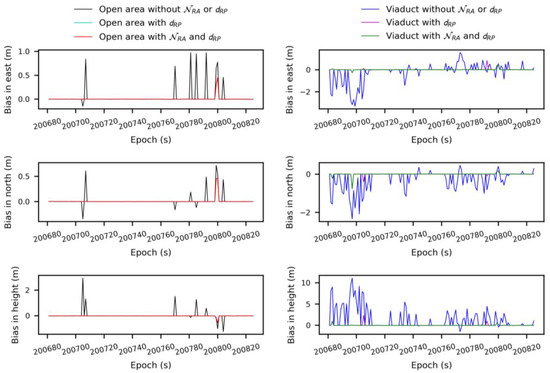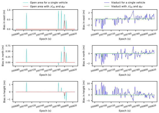 Once reliably fixed, the integer ambiguities make the carrier phase observables become a precise pseudorange. The fixed positioning solution is then achieved. The biases between the fixed positioning solutions and the ground truth in east, north and height directions are plotted in Figure 10 for vehicle 1 and in Figure 11 for vehicle 2. In these figures, there are spikes which have large biases. These spikes mean that the ambiguities are not fixed (ratio is less than 3) at these epochs and the incorrect float solutions have large biases. In the open area, the case without considering or gets the worst positioning results, and the case with constraint and the case with both and constraints have nearly equal biases in the three directions. This is because in Figure 9 both cases achieve a high success rate and all the ratio values are larger than 3, which means the fixed ambiguities are reliable and can produce high-precision positioning solutions. For most of the epochs, these cases can achieve centimeter-level precision. For the cases below the viaduct, the case without considering or still gets the worst positioning results. At certain epochs the case only considering worsens the position results comparing to the case considering both constraints, but at most epochs these two cases can achieve centimeter-level precision in east and north while the case considering no constraint gets very large biases. To compare the performances of our joint RTK method and single positioning by RTK, we conducted a single positioning experiment for vehicle 1, and results are shown in Figure 12. The results of the single positioning by RTK are quite similar to the results of the case with no constraint in Figure 10, which should be expected. Table 3 shows the statistical positioning precisions and fixed rates of these six cases and single positioning for the two vehicles. The fixed rates in Table 3 prove that our approach can largely increase the fixed rates below the viaduct where satellite observation condition is worse.