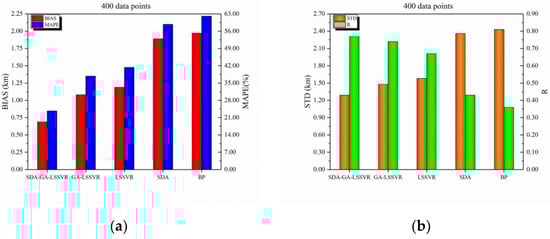 To verify the VTH retrievals from the hybrid SDA-GA-LSSVR model, a series of eruptions over Iceland’s Eyjafjallajökull volcano from April to May 2010 were selected as typical suitable cases. Back Propagation (BP), SDA, LSSVR, and GA-LSSVR were used as four benchmark models for comparisons with the hybrid SDA-GA-LSSVR model, and VTHs from CALIOP data in the independent samples were used as “truth” data for validation. The four evaluation indices mentioned above are used for inter-comparisons (Figure 3). Compared with the other four benchmark models, the hybrid SDA-GA-LSSVR model performs the best, with the lowest bias, STD, and MAPE, and the highest correlation with the CALIOP VTH product. Therefore, combining SDA, GA, and LSSVR increases the model performance.
