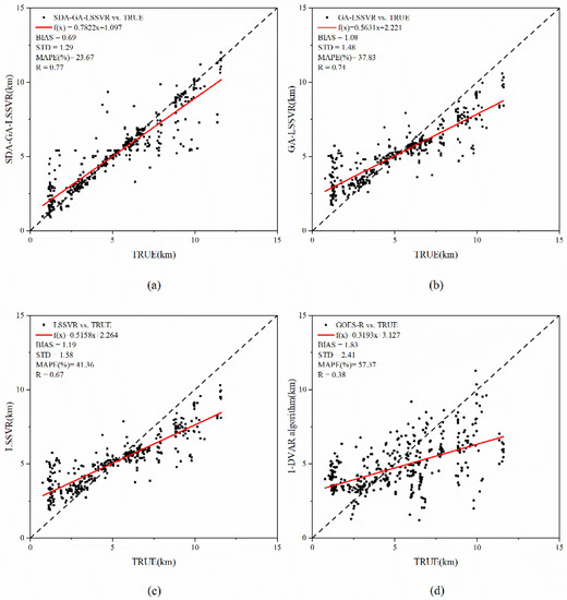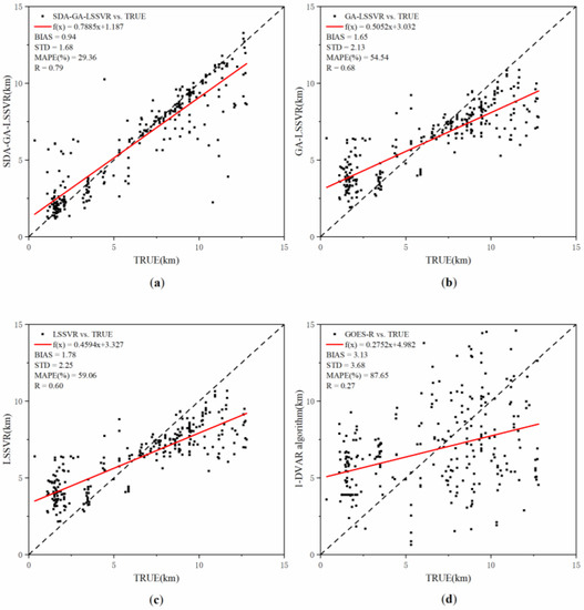 From the scatter plots of the VTHs from three machine learning models, along with the traditional 1-DVAR algorithm and the corresponding VTH product from CALIOP (marked as TRUE) (Figure 4), it can be seen that the hybrid SDA-GA-LSSVR model has the highest correlation with the “true” data (R = 0.77). The use of the GA-LSSVR yields a slightly reduced R of 0.74. When only the LSSVR was used, R is reduced further to 0.67. It is also worth noting that the three machine learning models generally perform better than the traditional 1-DVAR algorithm (GOES-R series algorithm) in this particular study.
